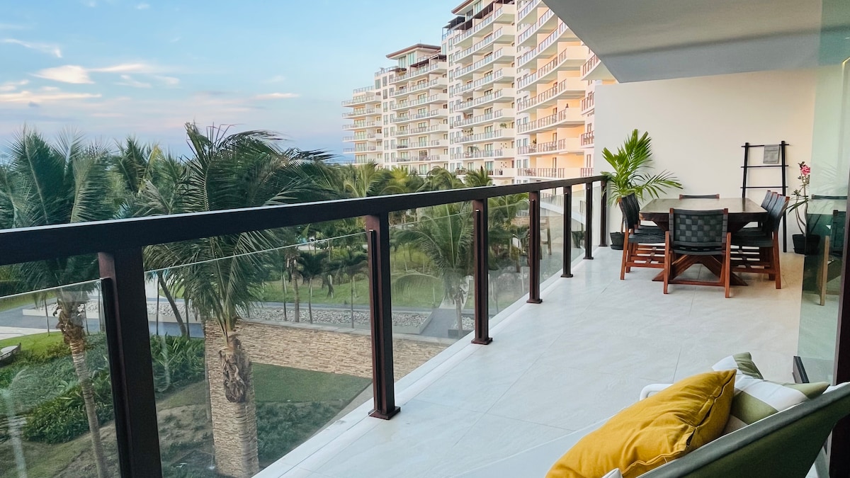 Modern and comfortable apartment in the heart of the Mexican Pacific, ideal for families or groups seeking rest, fun, and luxury in Acapulco Diamante. With 3 bedrooms and 3 full bathrooms, it accommodates up to 6 adults and 2 children. The stay includes a fully equipped kitchen, a balcony with partial ocean view, and all the comforts to make you feel at home. Views of gardens, palm trees, and pools within one of the most exclusive residentials in the area. Includes 2 parking spaces.