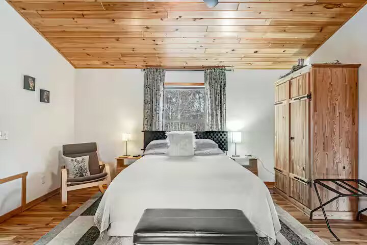 Ontkoppel. Ontspan. Kom in contact met de natuur. Kom genieten van onze 700 vierkante voet houten hut op 6 hectare bos. Vis de forelstroom, wandel, fiets, zwem Zie kolibries zweven bij de voederbak, kijk uit voor herten of Amerikaanse zeearenden. De mogelijkheden voor buitenrecreatie zijn eindeloos. Luister naar de wind die fluistert terwijl je in de hangmat schommelt. Speel in de boomhut! Ontsnap naar de vredige dennen en laat de nachtzwaluwen je in slaap zingen aan het einde van de dag. Neem je hond mee en geniet van het 111 vierkante meter grote privé hondenpark.
