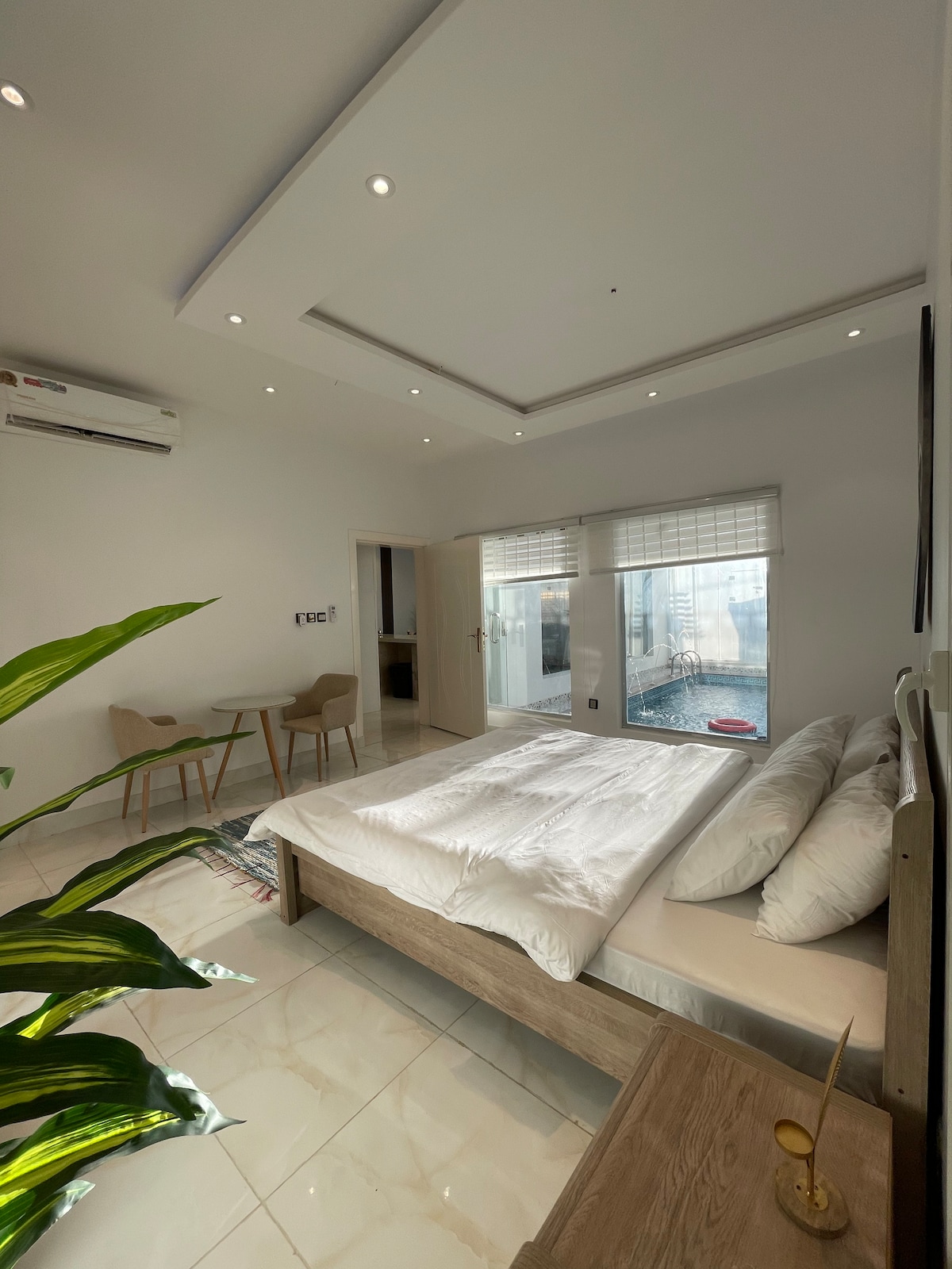 شالية ب غرفة نوم مطله على المسبح وجلسات خارجيه .