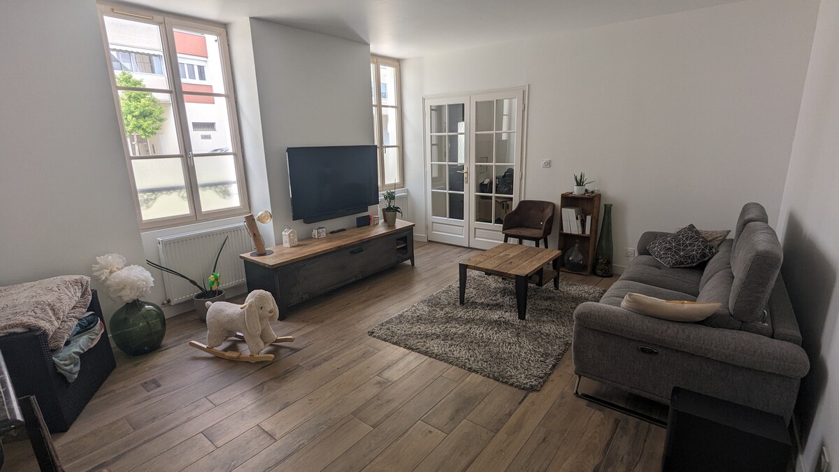 T2 van 64 m², op 200 meter lopen van het stadscentrum. 1 km vanaf de greenway, alle voorzieningen. Airbnb geclassificeerd ( geen opening in de grote ruimte) bestaat uit een slaapkamer (velux)+airconditioning met een bed 160 en een babybedje. Een woonkamer met slaapbank en bed van 90. Een toiletbadkamer, een open keuken, gratis parkeergelegenheid op straat, garage onder de Airbnb voor fietsen en motorfietsen. Toegang tot de les om te dineren, te roken en te ontspannen. Wifi kan zonder extra kosten.