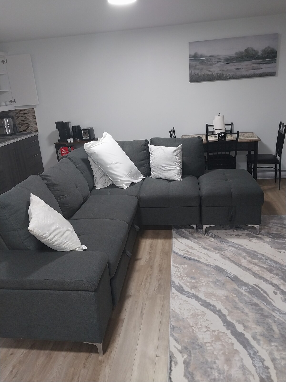 Welkom in ons gezellige en stijlvolle kelderappartement met één slaapkamer en een aparte ingang, gelegen in de rustige noordkant van Moncton. Binnen vind je een ruime slaapkamer met een queensize bed, een woonkamer met een tv en internet, en een volledig uitgeruste keuken met een eethoek. Er is ook een kantoorruimte voor werken op afstand, een badkamer en een eigen wasmachine en droger. De bank in de woonkamer is geschikt voor een volwassene of twee kinderen, waardoor deze ideaal is voor kleine gezinnen of extra gasten.