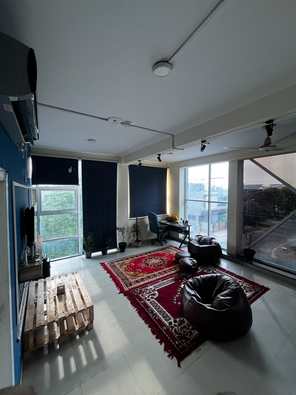 Als je de flat binnenkomt, voelt het alsof je een nieuwe wereld binnenstapt. De hele ruimte is geïnspireerd op de prachtige architectuur van Santorini en straalt de charme van Grieks design uit. Hoewel het een 1BHK is, is het ruim, open en perfect voor gezinnen of het organiseren van bijeenkomsten. Met een enorme 200-inch projector en een open indeling zonder scheidingswanden voelt de flat ruim aan, als een hele woning op zichzelf."