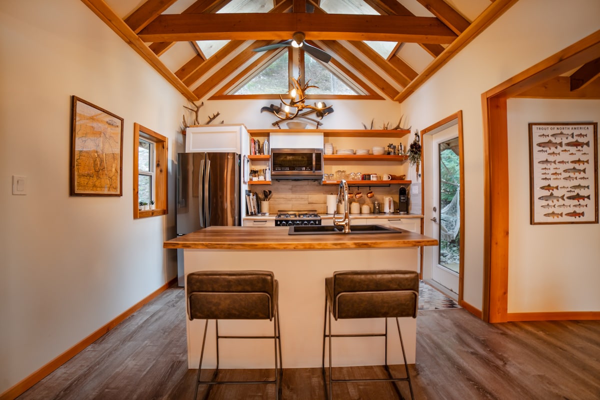 Escape to nature in our warm & cozy well heated geodesic dome, perfect for a peaceful retreat. Christmas Tree will be up Dec 10th! from the comfort of a King-sized bed, with large windows that keep you connected to the outdoors. Inside, you’ll find counter seating, kitchenette & bathroom. A short walk away is a fire table & private hot shower. Soak in your private hot tub or explore nearby hiking trails. Additionally the nearby creek offers the perfect white noise for an enjoyable night sleep!