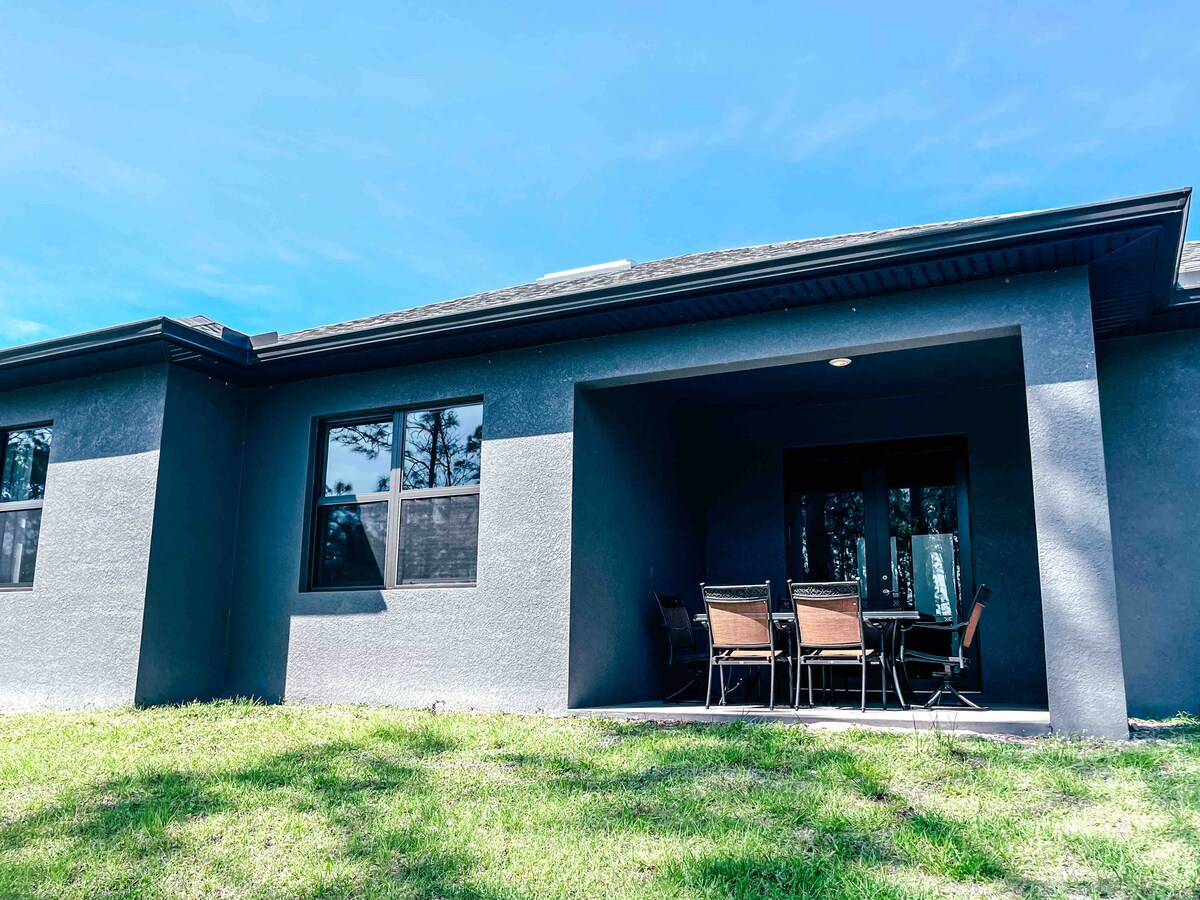 Ontsnap aan de stad naar een 3BR/2BA/1 kantoor op een terrein van 2+ hectare in een opkomende buurt. Gemeubileerd met wifi, smart-tv, basisapparatuur en wasserette. Keuken volledig gevuld met kookgerei, thee- en koffiebar. Genoeg parkeergelegenheid voor POV 's, boten en campers. De woning ligt in de buurt van nationale parken en natuurpaden. Een klein eindje rijden naar winkels, supermarkten en eetgelegenheden. Nieuw afgeschermde patio. Weg van sfeerverlichting en gelegen aan het einde van een lange straat voor een echte sereniteit. Op enkele minuten van de nieuwe stad Ave Maria. Laagste schoonmaakpercentage in de buurt.