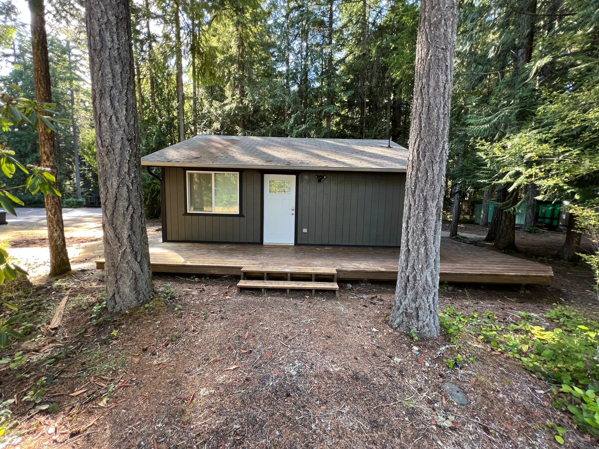 Lake Cushman tiny house met queensize bed en een beek