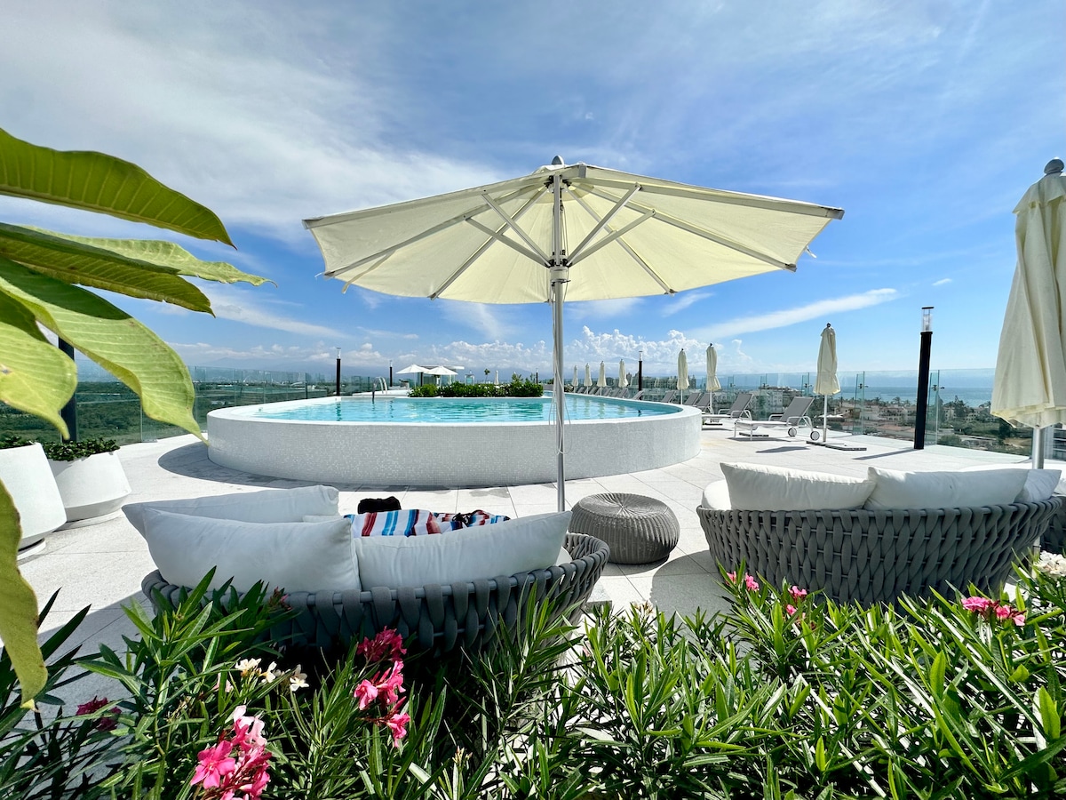Mooi appartement, fijn ingericht en ingericht om een vakantie door te brengen met familie of koppels die profiteren van de 3 goed uitgeruste slaapkamers met zijn 3 complete badkamers. Slaapkamer #1 kingsize bed, slaapkamer #2 kingsize bed en slaapkamer #3 met 2 tweepersoonsbedden. Grote sociale ruimte met 2 banken en 75inch tv met een bureau. Uitgeruste keuken en ruim terras met prachtig uitzicht op Banderas Bay. Het heeft een strandclub, 7 zwembaden, dakterras, restaurants, een fitnessruimte en een spa in Condominio Bolongo