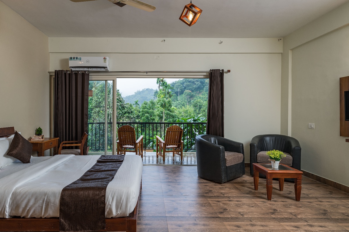 Cozy wooden cabin in Wayanad with a king-size bed, sofa, and private balcony overlooking lush greenery. Enjoy an LED-lit bathroom with rain shower, 24/7 hot water, and a shared infinity pool with mountain views. Ideal for couples and families, the cabin blends rustic charm with modern comfort. Includes breakfast, Wi-Fi, and access to nearby attractions. Kids 6–12: ₹600, above 12: ₹1000. Pool: 8:30 AM–7 PM, check-out: 11 AM.