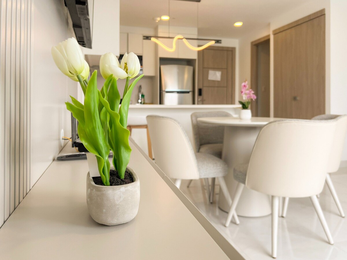 Modern appartement met zeezicht, op een steenworp afstand van El Murciélago Beach (locatie voor Ironman 70.3), Mall del Pacífico en top lokale restaurants. Perfect voor vakantie/werken op afstand met een monitor. Rustig, weg van straatlawaai. 24/7 beveiliging en snel glasvezelinternet. Voorzieningen zijn onder andere een zwembad, sauna en jacuzzi (open di-zo, het kan zonder voorafgaande kennisgeving veranderen). Het gebouw heeft een generator voor gemeenschappelijke ruimtes en een UPS houdt de wifi draaiende. Lift-, water- en internetwerkzaamheden tijdens storingen.