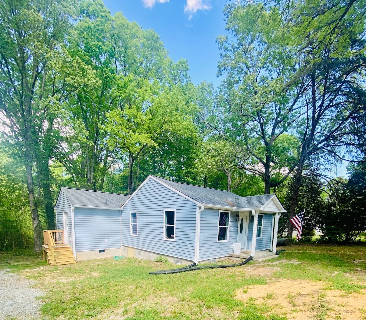 Hand-Hewn Log Home op 1,5 hectare met een nieuw toegevoegde buitenruimte in september 2025. 20 minuten naar Pineview, Waverly en Pavilion @Mimosa trouwlocaties. 5 minuten van de stad, 35/40 minuten naar Longwood U en Hampden Sydney College. Geen verkeer! Veel ruimte - 2 slaapkamers, volledig gevulde keuken, koffie- en theebars. Schoon en gezellig. De perfecte plek om te ontspannen, de stekker uit het stopcontact te halen en je klok te resetten We streven ernaar om de verwachtingen te overtreffen door onze hut te ontwerpen zoals Airbnb-vakanties ooit waren.