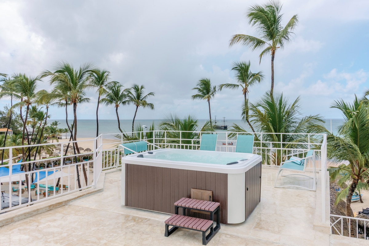 This luxury 3-level penthouse features a 1,000 sq ft rooftop terrace with panoramic ocean views—just 40 barefoot steps to Bávaro Beach! Enjoy a private heated jetted hot tub, waterfall, day bed, loungers, dining area, grill, and sink, all surrounded by tropical palms. Located in the heart of Los Corales, just a 5-min walk to shops, restaurants, bars, and a supermarket. Gated community with 24/7 security.