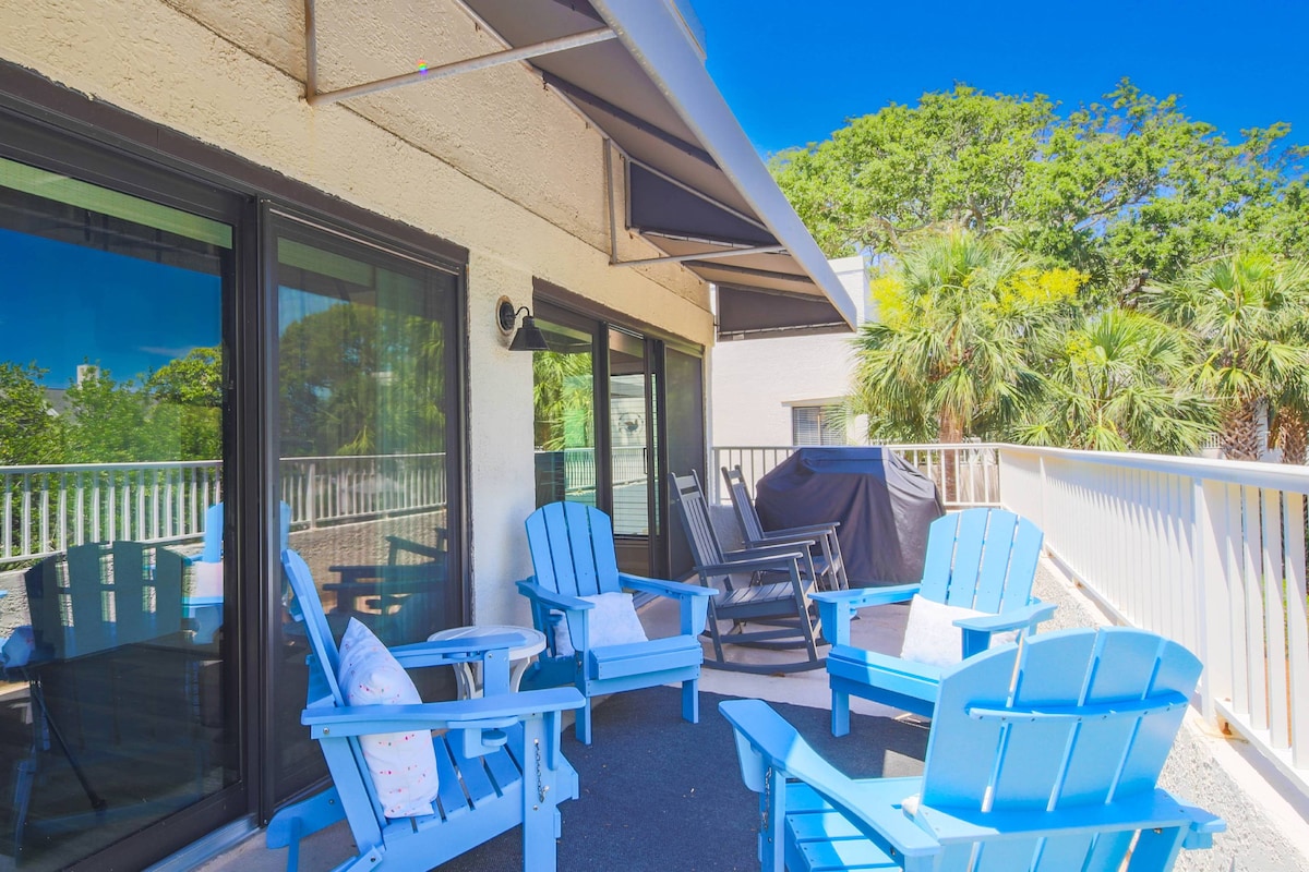 Gated Beach & Golf Resort! ✨ Top 10% Airbnb Guest Favorite ✨ Beach, Golf, Pool, Spa, Restaurants & Bars FREE Pickleball & Tennis – across the street HGTV Decorator designed Panoramic Golf & Lagoon Views! Big Porch Huge Old Oak trees! Coastal Décor Sunny 1st Floor End Unit KING BED + 2 QUEENS 3 XL SmartTVs FREE: FAST WIFI & CABLE Marble Kitchen Washer/Dryer Beach Cart, Chairs, Boogie Boards, Ice Chest BBQ Walk & Bike Path to Beach! Walk to Golf Club & Pub Close to Coligny Summer Beach Shuttle