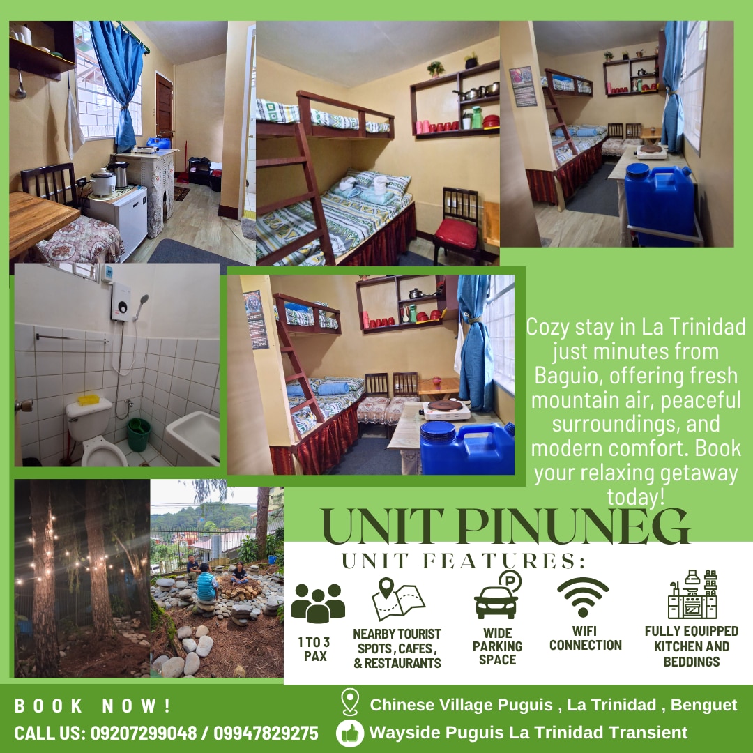 Onze gezellige ruimte is langs Marcos Hiway, in de buurt van een aantal van de beste instgramable cafés, zoals House of Yoghurt, PeakCup Coffee, Tan-aw sa Ala, Craft Brewery, Rocky Mountain Cafe en Hoka Brew. Het is een rustig uitje voor je familie of vrienden, of het nu voor een staycation of een rondleiding door de City of Pines is.