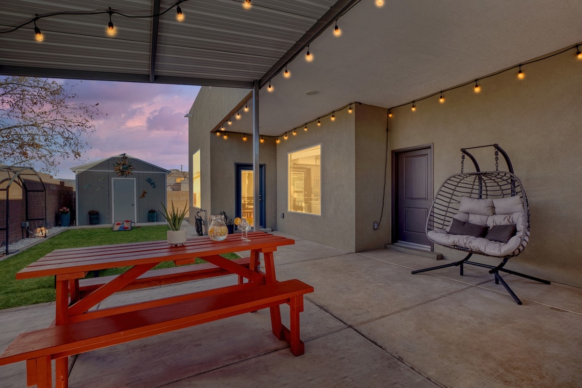 Ons prachtige zuidwesten huis heeft een queensize bed en een slaapbank in de woonkamer. Aan de woonkamer is een eetkamer met plaats voor 4 personen. Daarnaast bieden we alles wat je nodig hebt om te genieten van een ontspannen thuis weg van huis met een wandelende meditatietuin, twee patio 's om te dineren, een houten schommel buiten om te ontspannen met een kopje thee in de ochtend, een vuurplaats voor s' mores om te genieten van de prachtige nachten in Albuquerque. We zijn in de buurt van de rivier, paden, parken en markten.