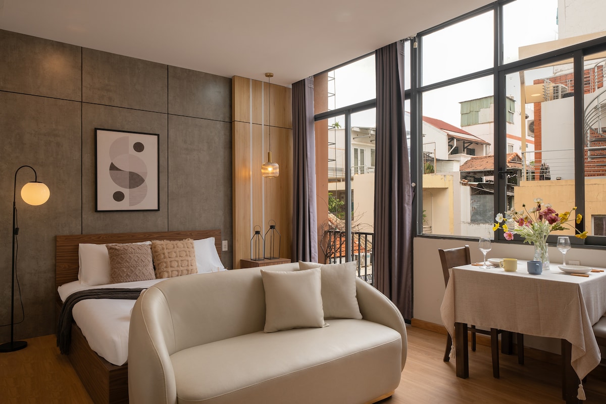 Laten we genieten van een stijlvolle ervaring in het stadscentrum! Het is ruim, schoon en heeft het natuurlijke licht. De eigen keuken en badkamer zijn gescheiden met de slaapruimte. - 1 zacht bed om goed te slapen - Balkon met mooi uitzicht op de stad - Lift, airconditioners, bank, kledingkast, eettafel - Koelkast, magnetron, rijstkoker, inductiekookplaat, waterkoker, kookgerei - Smart TV verbindt snelle wifi - GRATIS schoonmaak, wasserette+parkeerplaats - Toegang 24/7 & veilig #Adres: Nguyen Phi Khanh street, District 1