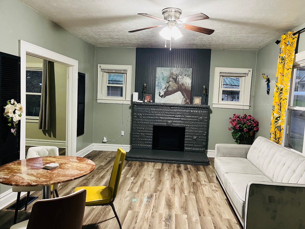 Single story (no steps) Bohemian style 1920's charmer with over 1,300 sq ft. The home includes 2 King Beds, formal dining, vintage style eat-in kitchen, power recling sofa, power standing desk, porch and private 2 car driveway. Preservation of originalwoodwork/moldings/hardware/character in home. Economally friendly on cul-de-sac in prestigious Forrest Hills subdivision. Located only 1.3 miles to KDMC. 6 m to Sandy's Gaming/ Malibu Jacks. Come have fun and enjoy your stay in our beautiful city