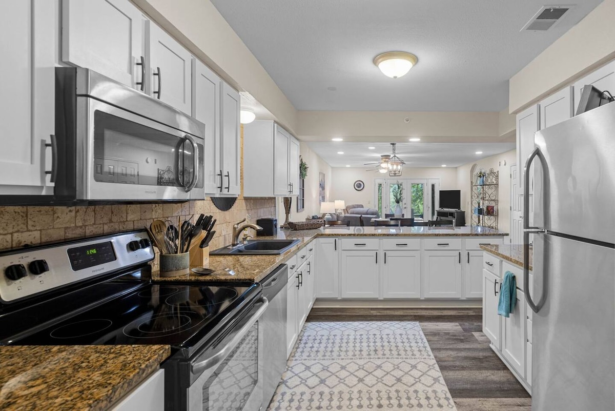 Gerenoveerd! Het appartement van ons gezin is een ruim appartement met 2 slaapkamers en 2 badkamers met twee kingsize bedden, een queensize luchtbed, een volledige keuken en een patio is een geweldige plek om te ontspannen. Gelegen op slechts enkele minuten van de 76 Strip in het hart van Branson, met alle opwinding en activiteit van het gebied in de buurt. Als je klaar bent met het plezier, kun je terugkeren naar de rustige Foothills en genieten van onze binnen-/buitenzwembaden, hottub en fitnessruimtes. Wifi, kabel, wasserette en een gevulde keuken zijn allemaal inclusief.