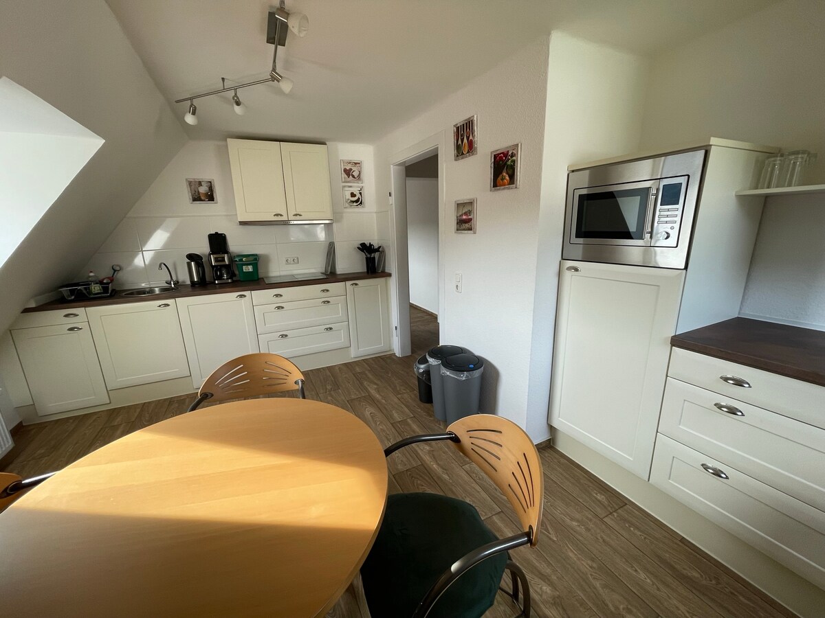 Fantastisch zolderappartement (130 m ²) in het hart van de vulkanische Eifel, in Mehren/Daun. Ideale locatie voor wandelaars/fietsers om de Maare en de Eifelsteig te ontdekken, een oase om te ontspannen. Ruime woon-eetkamer leidt naar de prachtige serre met open haard en naar het terras met comfortabel tuinmeubilair. Uitzicht over de accommodatie en de vallei. Volledig uitgeruste kit. Beide slaapkamers met tweepersoonsbedden (160 cm). Vanuit de grotere slaapkamer toegang tot het terras. Parkeren vlak bij het huis. Kinderen welkom.