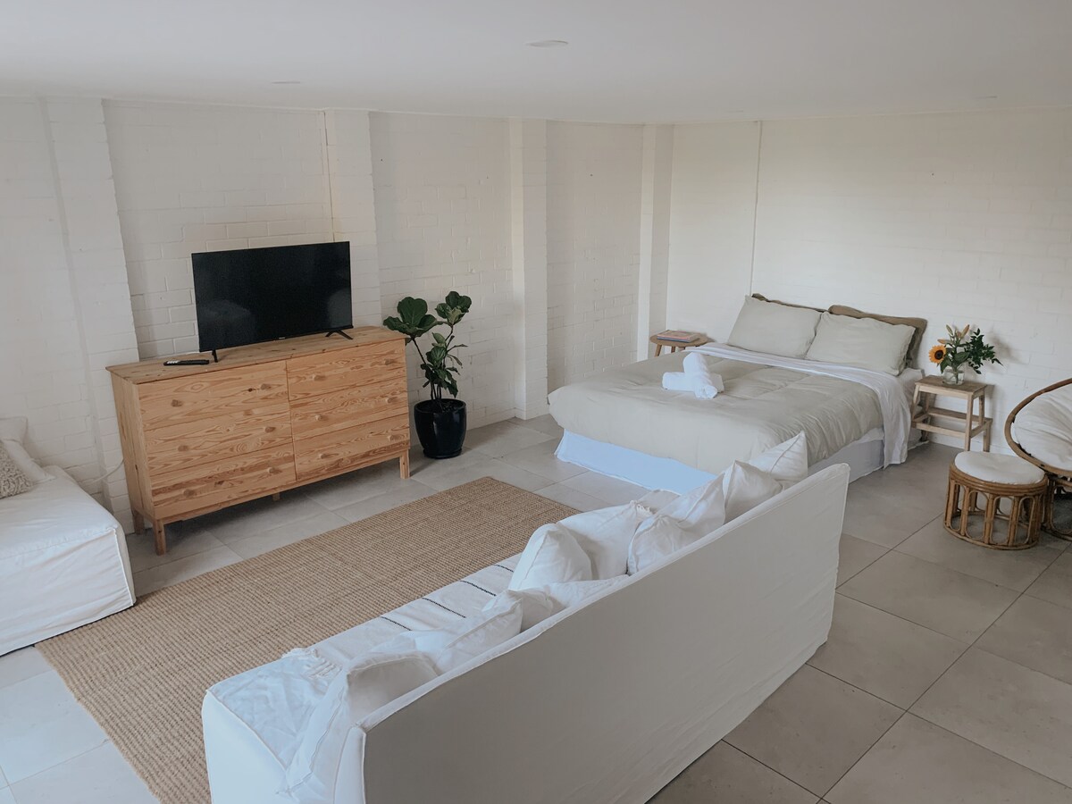 Vanaf het moment dat je door de poort stapt, voel je de ontspannen Byron-sfeer! Het is 2 minuten lopen naar de 'voorraadkast' van Baz & Shaz, 7 minuten naar het dorp Suffolk en 15 minuten naar Tallow Beach. Het centrum van het bruisende Byron ligt op 10 min rijden. De Suite heeft een kingsize dbl bed, ensuite, eigen ingang, eigen veranda en binnenplaats met tafel en stoelen, en een bureau in een hoekje. Er is een keukenkast met magnetron, barkoelkast, broodrooster, waterkoker en serviesgoed geschikt voor ontbijt en het beheren van afhaalmaaltijden.