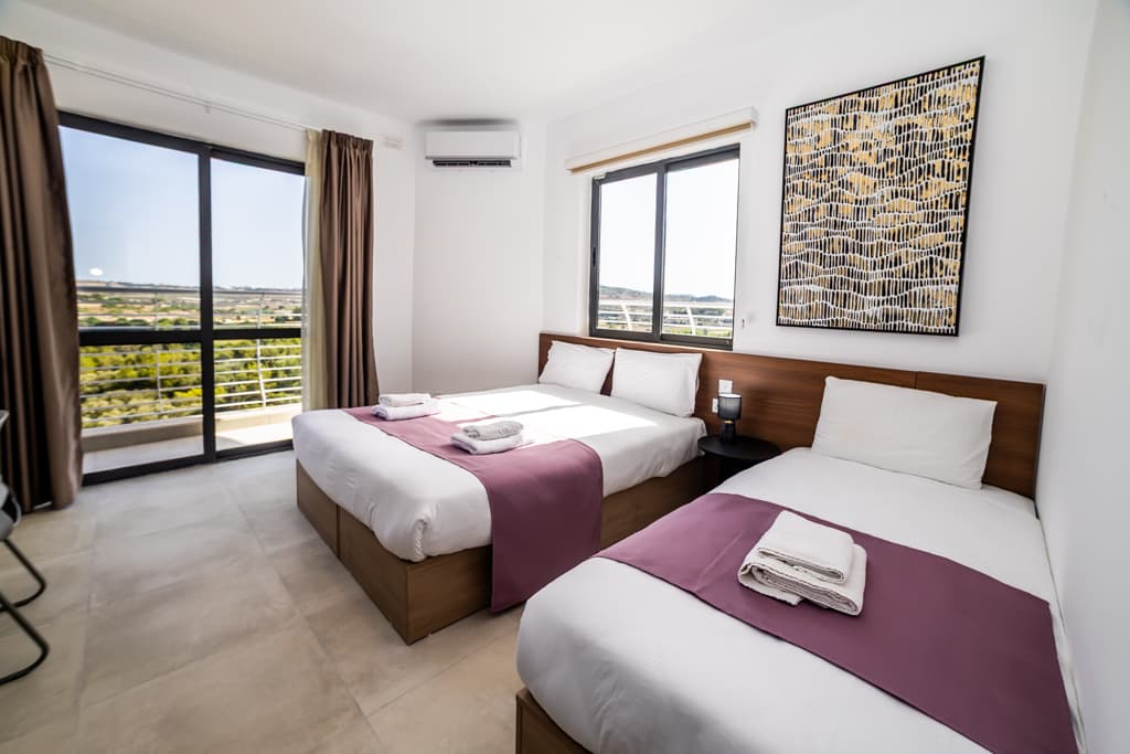 Gloednieuw appartement, gelegen in een rustige omgeving op tien minuten lopen van de St.Paul Bay waterkant. De Blue Apartment biedt haar gasten een appartement met een modern design en alle gemakken. Het bestaat uit een slaapkamer met tweepersoonsbed, een slaapkamer met twee aparte bedden, twee badkamers (een met douche en een met bad/douche), een open keuken met woonkamer en twee balkons. Handdoeken en lakens inbegrepen.
