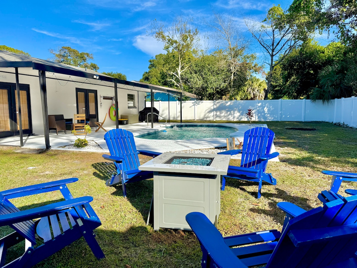 Laat al je zorgen en problemen achter je terwijl je ontspant en ontspant in een rustige en ruime omgeving met hoge plafonds. Geniet van de vrijheid om diep in te ademen, los te laten en op te laden in een dennenbos in de achtertuin, of geniet van de rust in de rust van een met scherm bedekte patio. 15 minuten van Historical Flagler Beach. 5 minuten loopafstand van het gemeenschappelijke zwembad - $ 4 toegangsprijs. Supermarkten, restaurants en 95 FWY zijn binnen 10 minuten met de auto. 5 minuten met de auto naar Lehigh Trail/Fietspad.