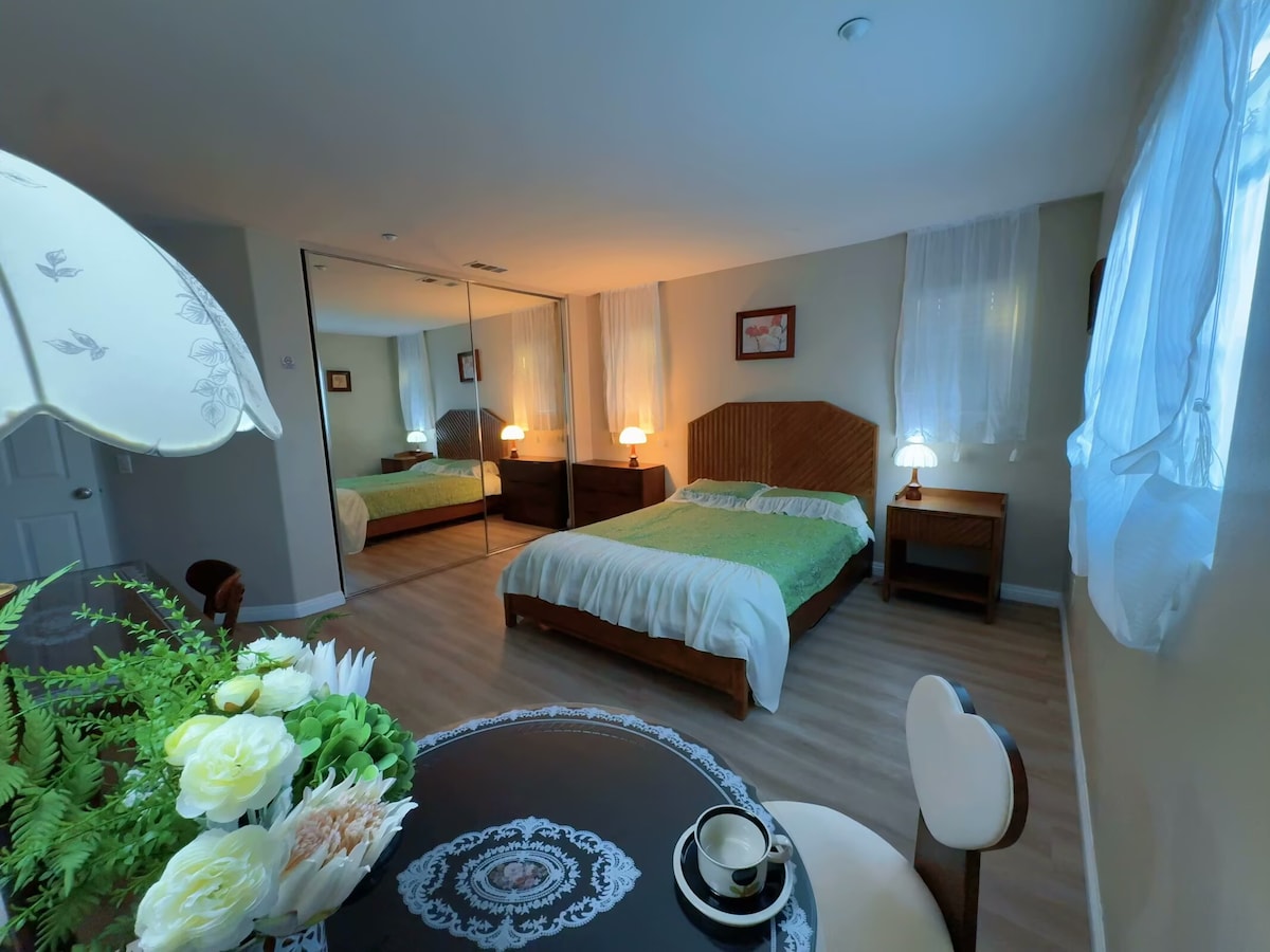 This is a nice master bedroom, converted to a guest suite. The room has a private entrance, and private bathroom. Walls were recently torn down & made sound proof so as to not disrupt our guest with noises inside the house. This house has a lot of history, it’s over 120 years old. It’s perfectly situated about a minute away from the freeway is a central locations, in the beautiful & historic city of Redlands. Security cameras recording at all times all around the outdoors of the property.
