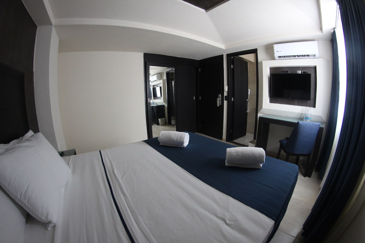 Deze kamers op straat met een kingsize bed zijn uitgerust met een LED-SMART-TV en laptopvriendelijke werkplek, wifi, USB-poorten en stopcontacten en warme douches. Ons pand beschikt over efficiënte kamers met een focus op de gemeenschappelijke ruimtes voor gasten loungen. Inclusief handdoeken en beddengoed, A/C op de kamer, traagschuimmatrastopper en gratis gebruik van Cowork Hot Desk. Een magnetron en gratis ochtendkoffie in de lobby van het hotel. Mini-koelkasten $ 50 pesos/dag op aanvraag
