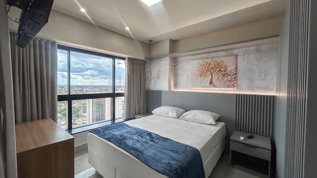 Muito conforto e praticidade, no 18º andar, e na melhor região de Campo Grande. Próximo à avenida Afonso Pena e ao Shopping Campo Grande. Estúdio conta com ar condicionado, cama Queen Size, Tv 55' c/ Netflix, cozinha compacta, sofá cama. Dispomos de colchões extras. Temos opções de Cesta Café da Manhã e Pacote de Decoração Romântica. No Vertigo Premium Studios você tem acesso a Salão de Beleza; Sauna; Piscina Aquecida e com Borda Infinita.