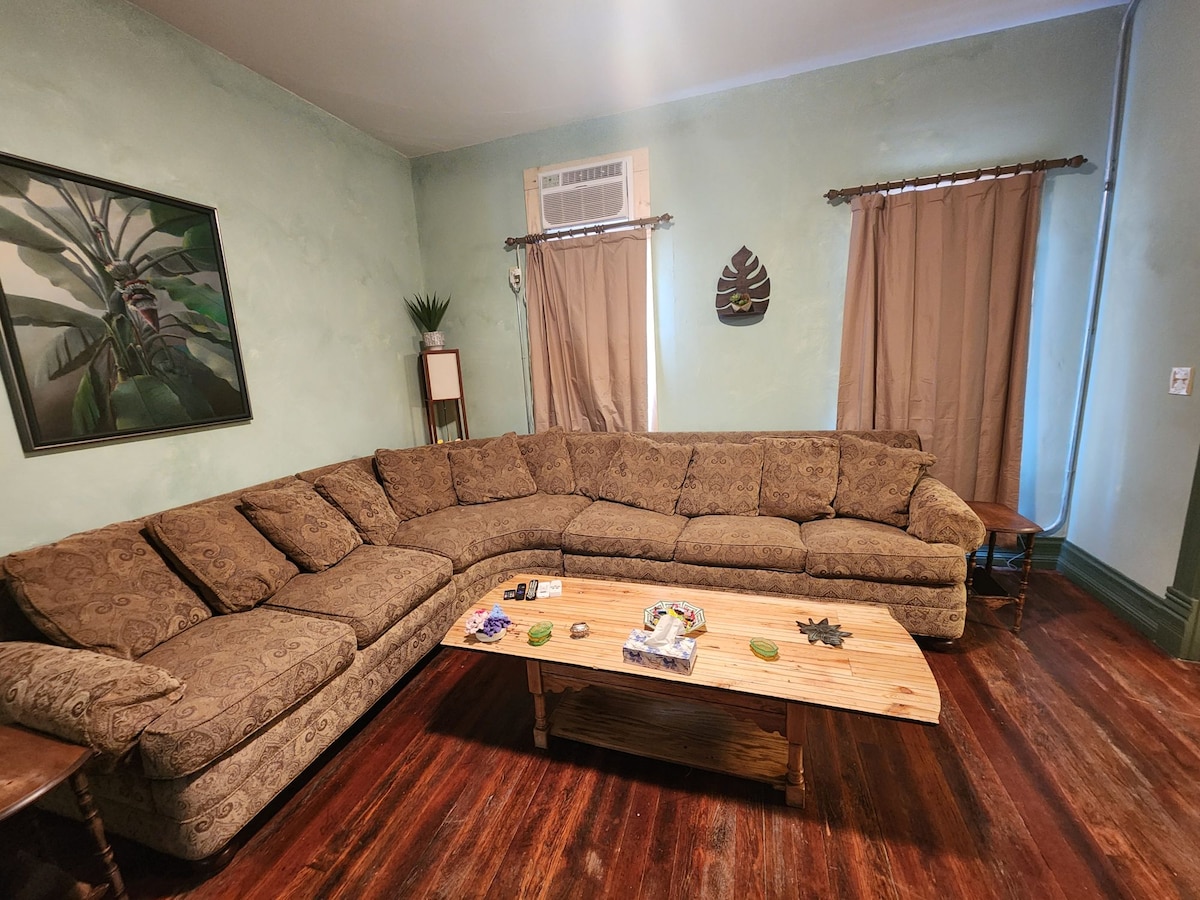 420-vriendelijk, dit onlangs gerenoveerde ruime appartement is gunstig gelegen aan de Mississippi River-kant van Main St in het hart van het centrum van Savanna. Je hebt alle toegang zonder lawaai. Prachtig uitzicht op de rivier vanaf je eigen privédek. Of je nu op zoek bent naar een romantisch weekend, buitenavonturen of schilderachtige bochtige wegen om te rijden, wij staan achter je. Comfortabele banken, kingsize bed, bad op pootjes alles wat je nodig hebt om je comfort te verbeteren terwijl je bij ons verblijft bij Damage Control.