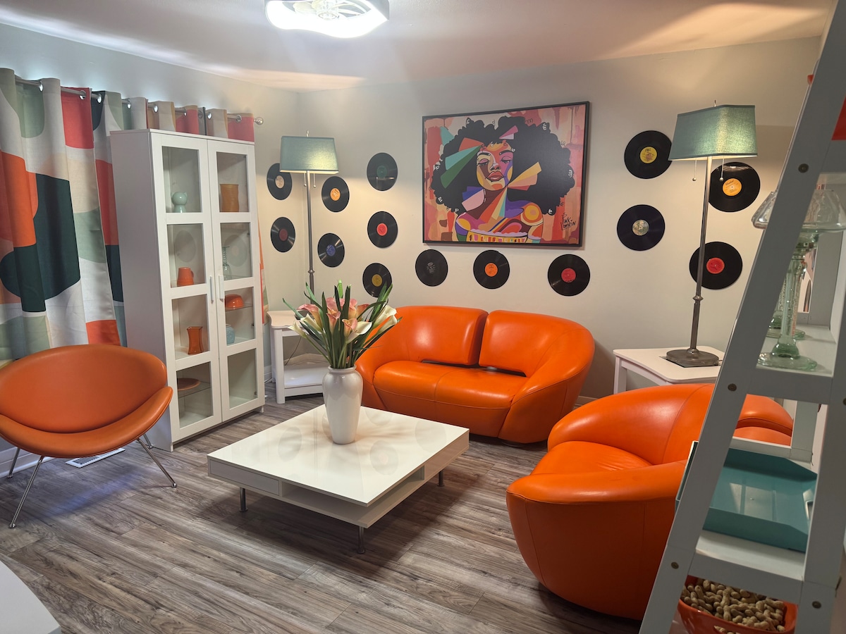 Do not be misled by its humble exterior; enter a 1970s-inspired sanctuary where bold colors, vintage décor, and sumptuous furnishings merge with retro charm to create a truly regal and inviting escape. Nestled in Castle Point, an urban neighborhood of true character it’s not the suburbs! This exquisite retreat is perfect for couples aged 28 and older seeking elegance, comfort, and a touch of nostalgic splendor. Each honored guest is presented with one complimentary glass of non-alcoholic wine.