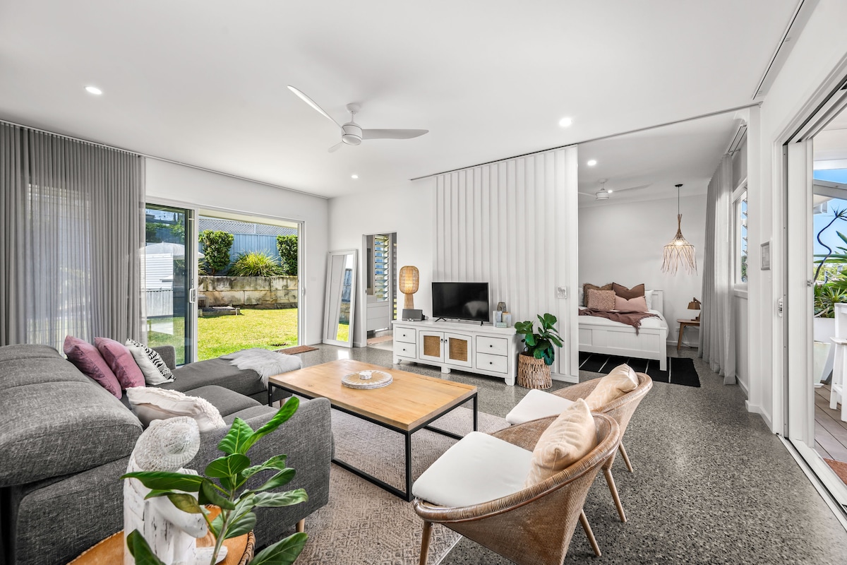 Gelegen tussen het strand en het meer aan het einde van een rustige doodlopende straat met een pittoresk uitzicht op de lagune! En op slechts enkele meters afstand van de toegang tot de beroemde nieuwe Fernleigh Track! Dit volledig uitgeruste gezellige huis met één slaapkamer is splinternieuw en brandschoon! Volledig uitgerust met alle beddengoed, handdoeken, zeep, shampoos, toiletpapier, Nespresso koffiezetapparaat + koffiepads, waterkoker, oploskoffie, theezakjes, suiker, broodrooster, airfryer en al je keukenbenodigdheden.