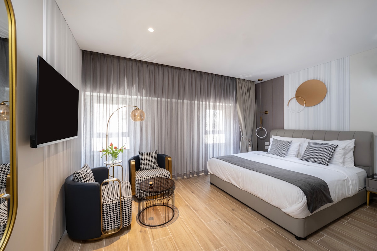 Superior Room – Comfortable & Stylish for Solo Travelers or Couples Perfect for a solo guest or a couple, our Superior Room is fully equipped to meet our highest standards. It features a comfortable queen-size bed with soft, high-quality linens, a work desk, and a flat-screen TV. The bathroom is elegantly finished with black marble and includes a full set of premium toiletries.