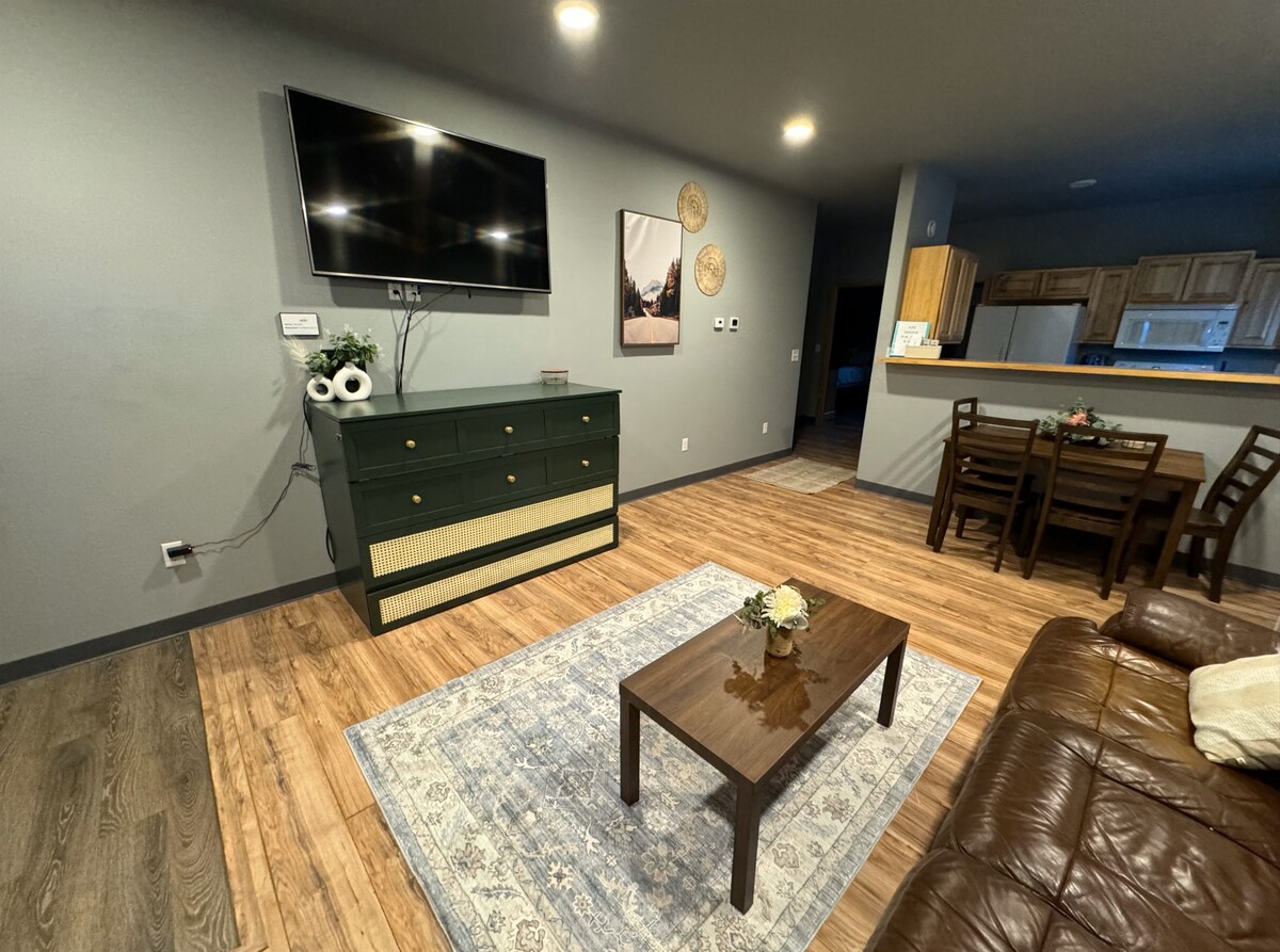 Welcome, here you will find a private driveway leading up to your own patio with outdoor seating. Inside is a newly remodeled Boho inspired open concept unit. Walking through the kitchen/dining area into the living room is a pullout couch with extra linens and large windows to let in the Alaskan sun. The bedroom is equipped with a Queen bed, floating nightstands, large closet and black out curtains. Check out our guidebook for our favorite activities and places to eat!