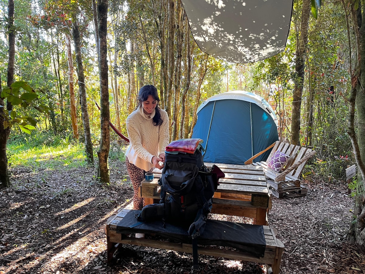 This is a comfortable and very private glamping without immediate neighbors. It is a small structure very similar to a tent. There is a double bed with linens. The platform it is on is large and has a hammock and a table and benches. There is a bathroom with a shower that has hot water nearby and an outhouse closer for middle of the night visits. You may reach us walking or by 4x4. We are happy to pick you up at the parking area. We have Starlink wifi and hot water