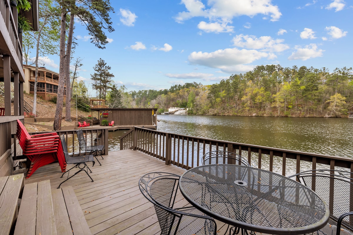 Geniet van zitten en dineren op deze ruime veranda met uitzicht op het hoofdkanaal van Lay Lake. Het is echt een van de beste plekken aan het meer!! Ontsnap naar dit prachtige huis aan het meer en begin herinneringen te maken! Deze 2 slaapkamers 1 badkamer is volledig uitgerust met alles wat je nodig hebt voor een stressvrije vakantie. Je krijgt je eigen bootlancering, pier en 2 jetski-dokken. Ontspan 's avonds van het vuur terwijl je smores maakt. Houtskoolgrill in de buurt van het eetgedeelte. Brandstof en benodigdheden in de nabijgelegen jachthaven.