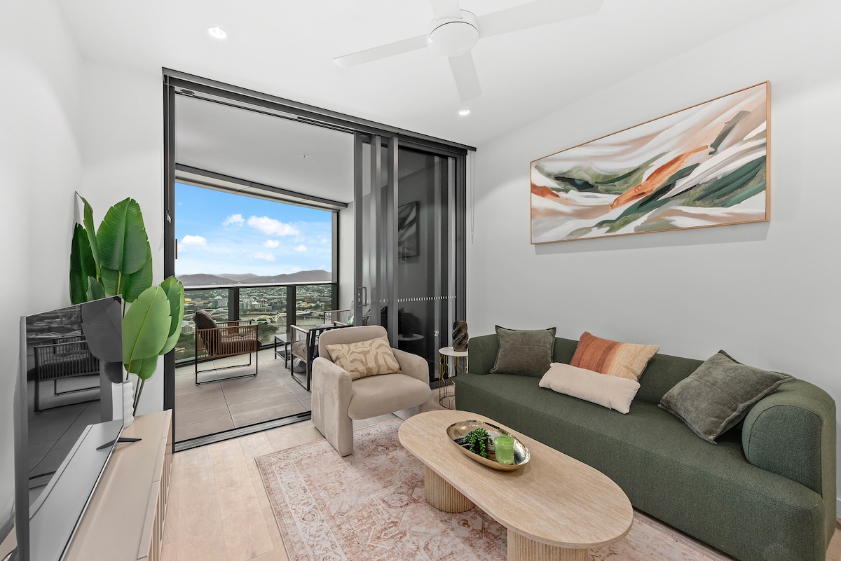Welkom in je stedelijke oase! Deze studio beschikt over een privéterras in de tuin op het dak met uitzicht op het achterland. Geniet van het open ontwerp met kamerhoge ramen, een kitchenette, eetkamer, lounge en slaapkamer. Perfect voor werk of ontspanning, yoga of kleine bijeenkomsten. Heeft een studeertafel en grote eettafel. Ideale locatie voor Southbank, The Gabba, QPAC, Riverstage, Suncorp Stadium en het Convention Centre. Inclusief een 55-inch smart-tv + gratis Netflix en gratis parkeergelegenheid. Een perfect toevluchtsoord in de stad!