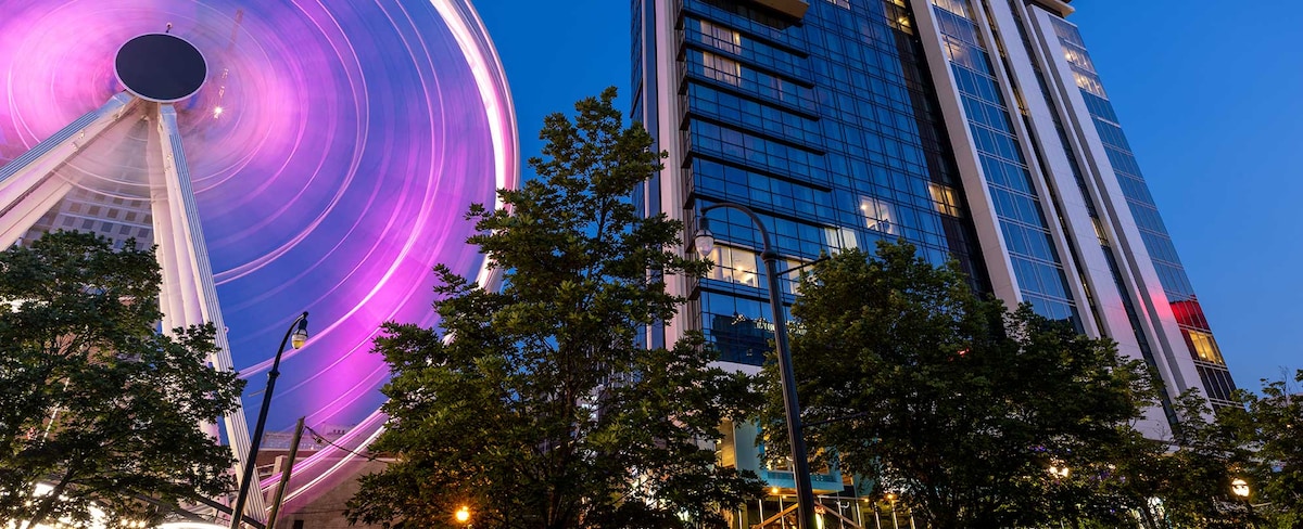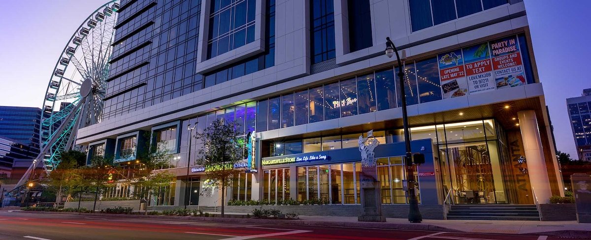 Ervaar Atlanta in stijl in deze moderne studio op een steenworp afstand van Mercedes-Benz Stadium, State Farm Arena en Centennial Park! Deze chique ruimte bevindt zich in de exclusieve Wyndham Margaritaville-toren en biedt plaats aan maximaal vier personen met een pluche kingsize bed en een queensize slaapbank. Geniet van een kitchenette, een strak bad en voordelen in resortstijl: een zwembad op het dak met uitzicht op de skyline, dineren op het terrein, een fitnesscentrum en een bar op het dak, perfect voor cocktails bij zonsondergang. Loop overal heen, ontspan in comfort en maak je ATL-verblijf onvergetelijk!