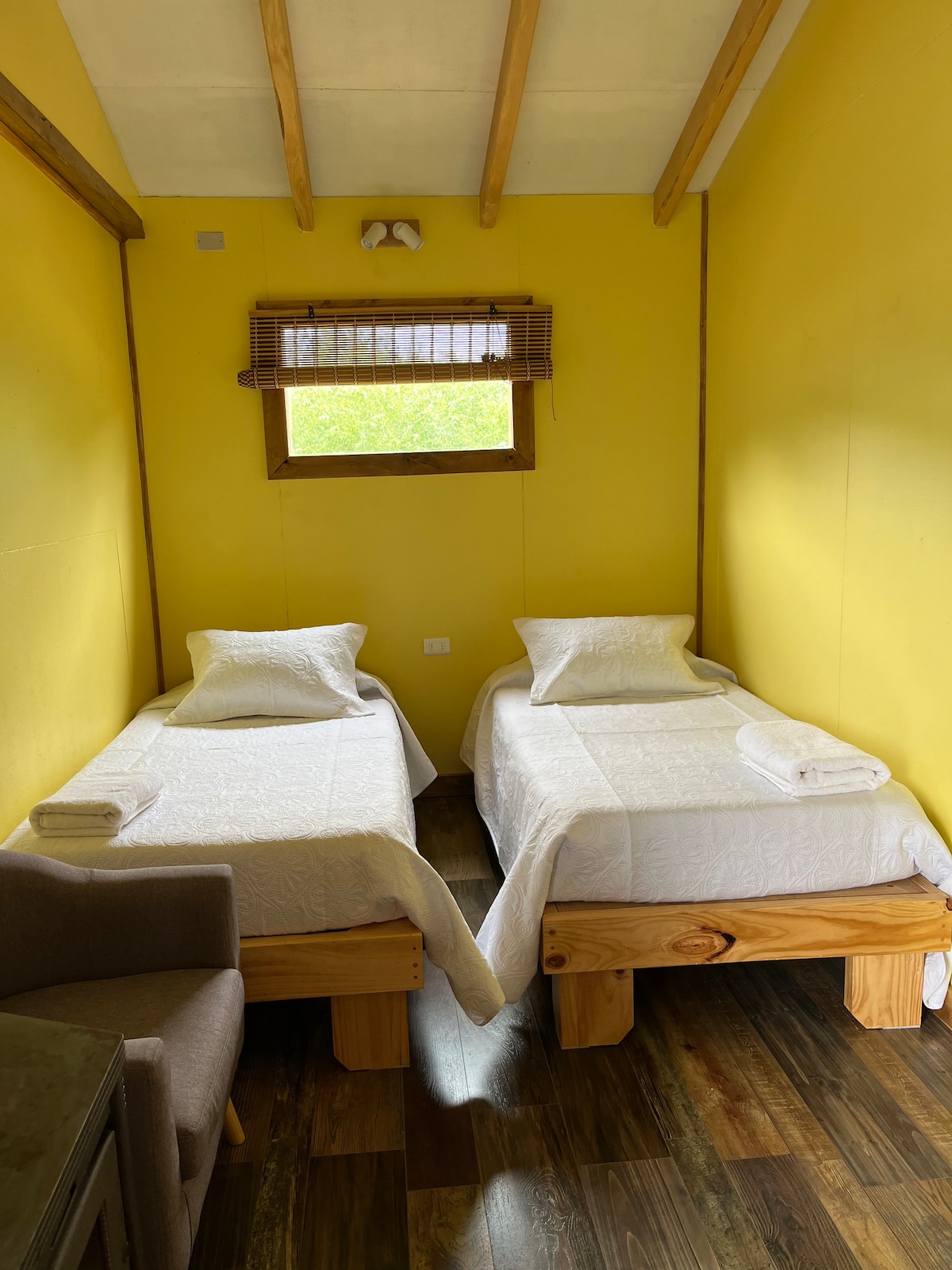 Deze verenigde ruimte heeft alles in een enkele omgeving, de bedden zijn comfortabel, alle elementen zijn gemaakt van inheems hout en de doos om schoenen achter te laten is van hout met agaatsteen van Puerto Guadal Beach. De badkamer is privé, de keuken is volledig gevuld met een minibar en maakt deel uit van de ruimte.