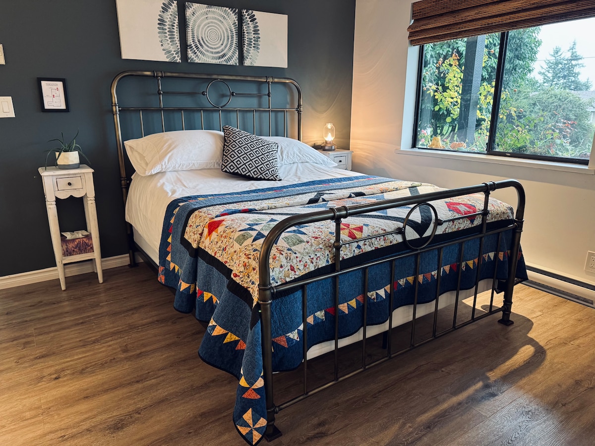 Verblijf in het hart van Comox Deze lichte privésuite met twee kamers ligt op een steenworp afstand van cafés, restaurants en de oceaan. Het is je stijlvolle, zorgvuldig ingerichte thuisbasis om de prachtige Comox Valley te verkennen. Geniet van de boetiekaccenten: een regendouche, een diep bad en een goed uitgeruste kitchenette voor een ontspannen verblijf. Gezinsvriendelijk met baby- en peuterbenodigdheden (box, kinderstoel, speelgoed) om reizen gemakkelijker te maken. We kunnen niet wachten om de schoonheid van de regio met je te delen!
