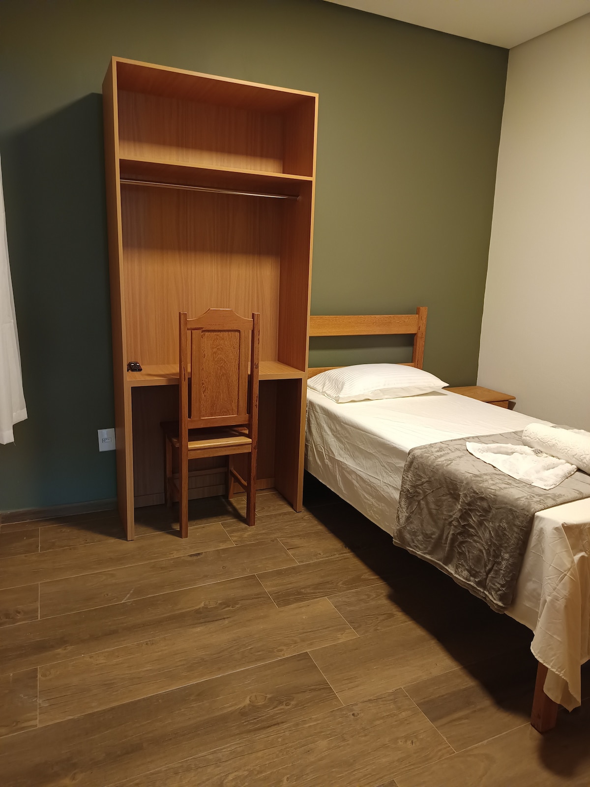 Nossa Suíte Solteiro acomoda 1 pessoa com 1 cama de solteiro, smartv, sky, frigobar, mesa de trabalho, ar condicionado, wi fi gratuito. Estacionamento disponível mediante solicitação prévia.