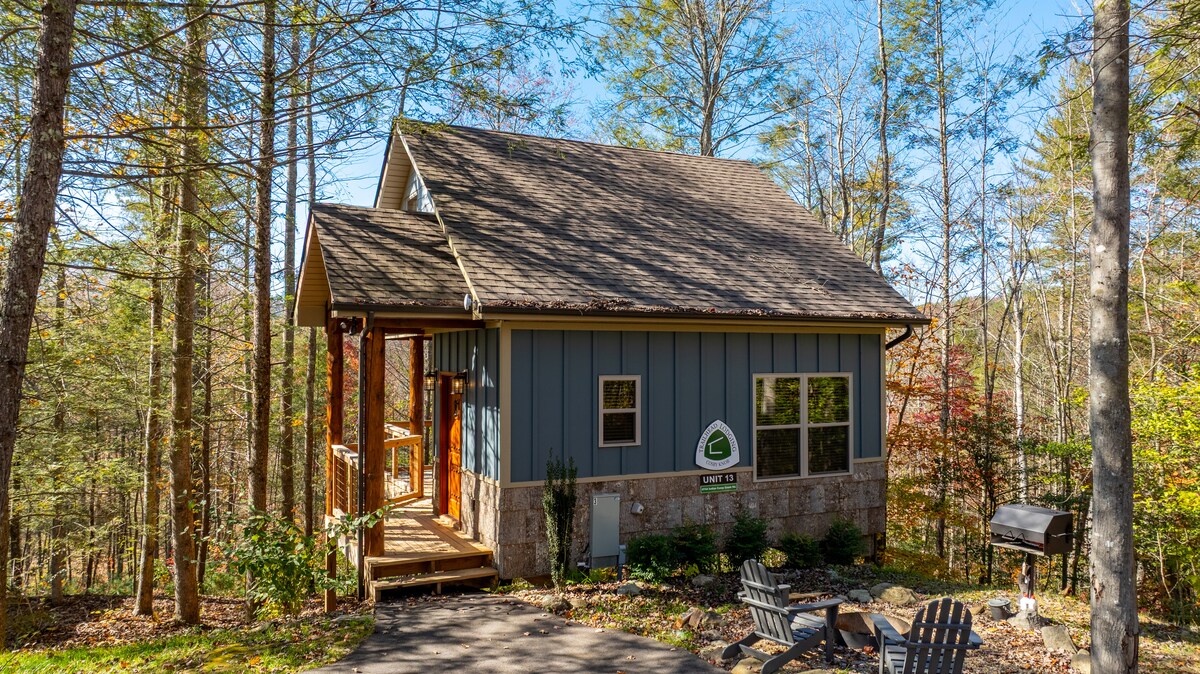 Inviting private mountain cabin in a wooded setting with 2 queen bedrooms & black out curtains. Enjoy the open concept with a stocked kitchen, reclining couch and chair and wood-burning fireplace. Enjoy the private spacious porch complete with hot tub, hammocks, rocking chairs, and outdoor dining. Fire up the gas grill for a cookout, or wind down around the firepit under the stars. In a true country setting—expect barking dogs, buzzing bugs, and plenty of rustic charm. Pet-friendly too!