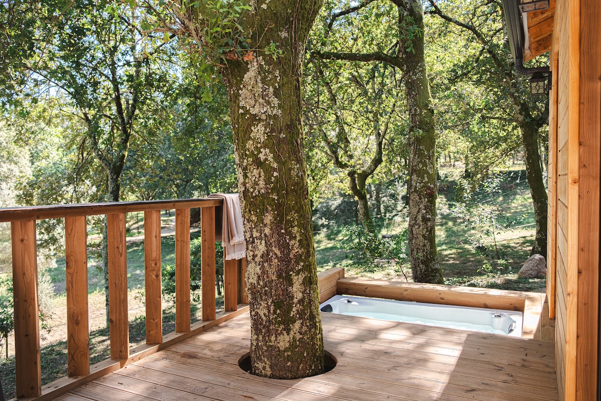 Encantadora casinha de madeira no coração da natureza, perfeita para escapar à rotina. Rústica, sustentável e luxuosa, com detalhes equestres. Sala e quarto com grandes janelas e vista para os cavalos, ar condicionado, cozinha equipada e casa de banho rústica. Varanda privada com jacuzzi. TV e Wi-Fi disponível. Acesso à Quinta por caminho no bosque, com estacionamento a poucos passos. Ideal para relaxar e explorar trilhos a pé ou a cavalo. Uma experiência única e inesquecível espera por si!