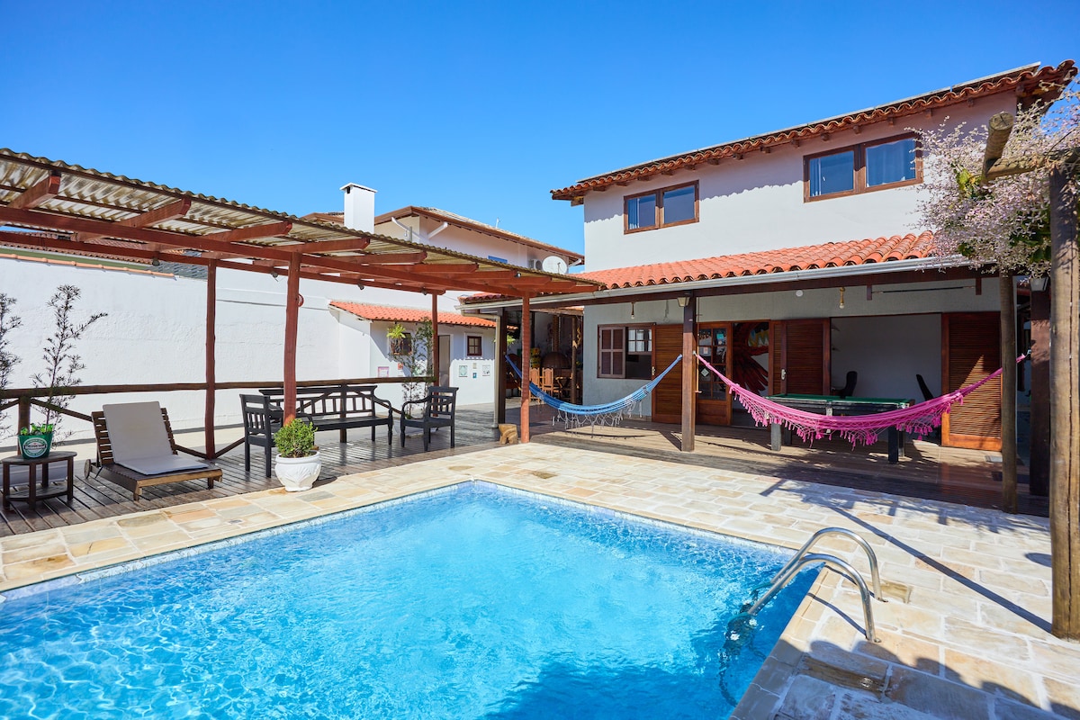 Huis met 2 suites met extra matrassen te huur met meer dan vier personen, woonkamer, Amerikaanse keuken, toilet, airconditioning, tv en wifi, ligt in de wijk Chácara, op 600 meter van het historische centrum - op 8 minuten lopen - aan een doodlopende straat naast de rivier de Perequê Açu in de buurt van het busstation en gemakken.