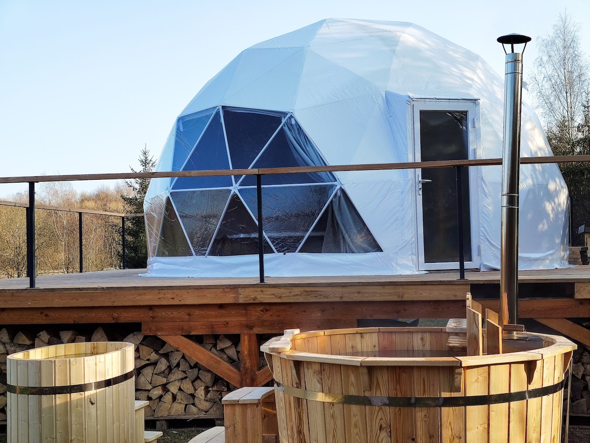 Glamping koepel met buitenbubbelbad en sauna