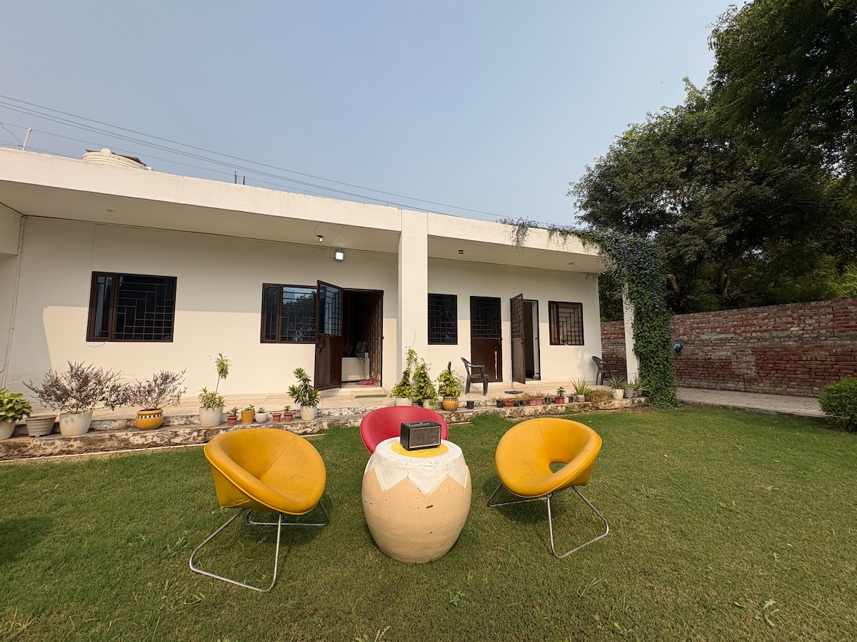 Een Brits huisje op het platteland met prachtige rozen, een weelderig gazon en een romantisch zwembad voor een gelukkig uitje uit de stad. Het huisje ligt op een uur rijden van Gurgaon en bevindt zich in een prachtige rij boerderijen, dicht bij mosterdvelden en een cricketveld. Zeer dicht bij Heritage Transport Museum (5,3 km) en NeverEnuf Rail Garden (3 km). Perfecte setting voor een weekendje weg!