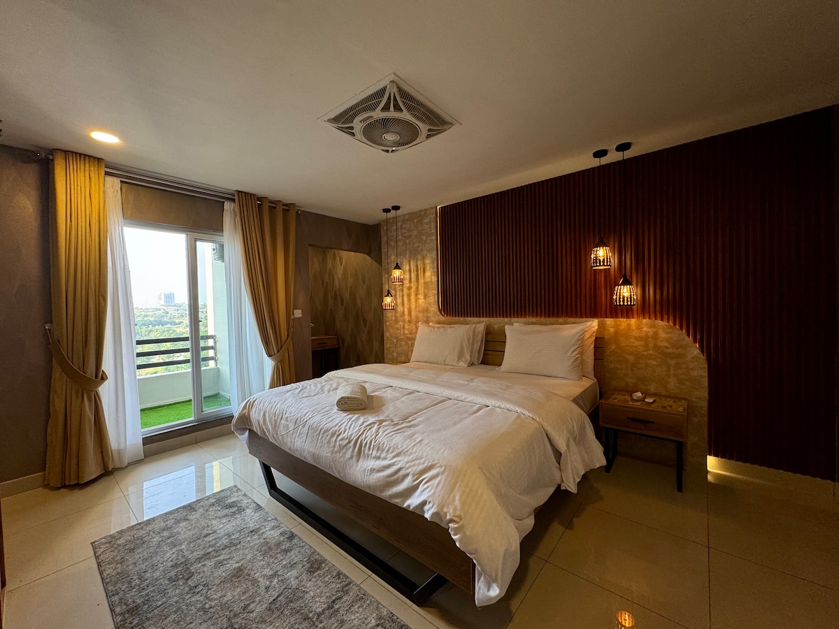 Modern, gezellig en luxueus verblijf in Bahria Town Islamabad met zelf inchecken, gratis parkeren, snelle wifi en Chromecast-compatibele tv. Geniet van een kingsize bed, een eigen balkon met uitzicht en zitplaatsen, een kitchenette (koelkast/vriezer, magnetron en elektrische waterkoker) en een gevulde badkamer. Ontbijt en roomservice beschikbaar op aanvraag en tegen betaling. Eigen café en restaurant beschikbaar. Toplocatie in de buurt van parken, winkelcentra en restaurants, op slechts 12-15 minuten rijden van DHA2 en Giga Mall en op minder dan 1 uur van de luchthaven.
