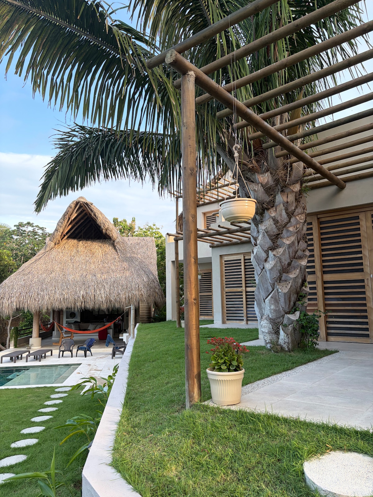 Amazing house in the center of Palomino only 3 blocks to the beach, river, and downtown. Private Garden and Pool + Super Fast Starlink Internet. 2 Bedrooms, a large living & dinning room, kitchen, and bathroom featuring an open air shower. Great patio and pool with outdoor dinning area and hammock, as well as expansive grounds. Enjoy the tropical excitement of this special place right next to a beautiful national park. Nature and convenience await you, including fast Starlink Internet.