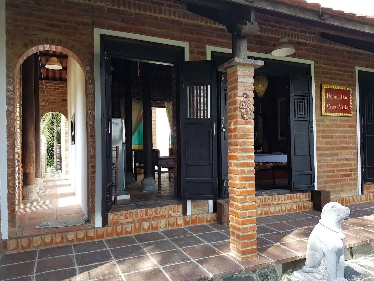 De architectuur wordt gedomineerd door rustieke rode bakstenen en donkere, stevige houten pilaren, die de elegantie van traditionele Vietnamese huizen oproepen. Binnenin staat eenvoudig maar verfijnd antiek houten meubilair, waaronder klassieke gesneden ligbedden en tafels, allemaal tegen de achtergrond van de zichtbare bakstenen muren en terracotta tegelvloeren. Buiten opent de villa naar een rustige kokosnoottuin, die een vredig toevluchtsoord biedt uit de drukte van de stad.