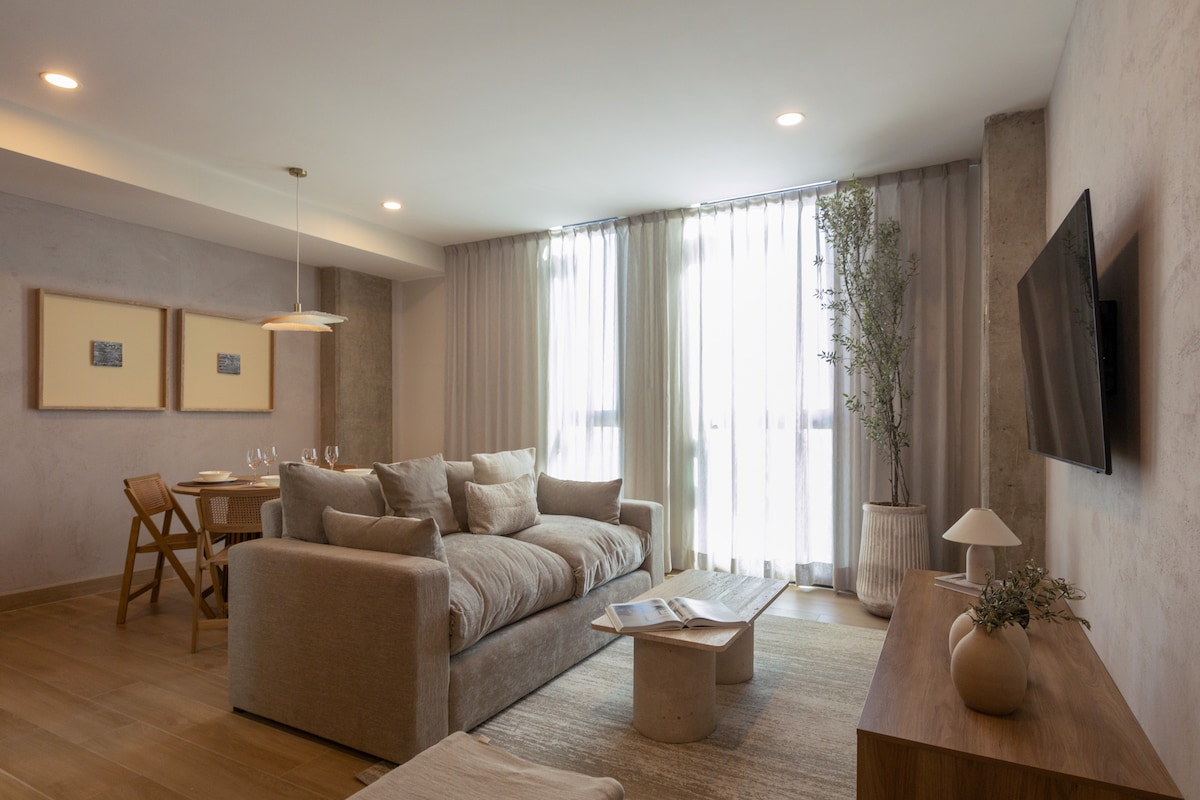 MORADA LIVING Perfecto para amigos, compañeros de trabajo o viajeros que prefieren dormir por separado, este estudio ofrece dos camas individuales, sofá cama, cocina completa, Smart TV y escritorio. Su diseño moderno lo hace práctico y cómodo para estancias cortas o largas. El edificio cuenta con áreas comunes agradables y se encuentra en una ubicación estratégica: cerca del Centro Histórico, Colonia Americana y Parque Agua Azul. Comodidad, flexibilidad y ubicación en un solo lugar.
