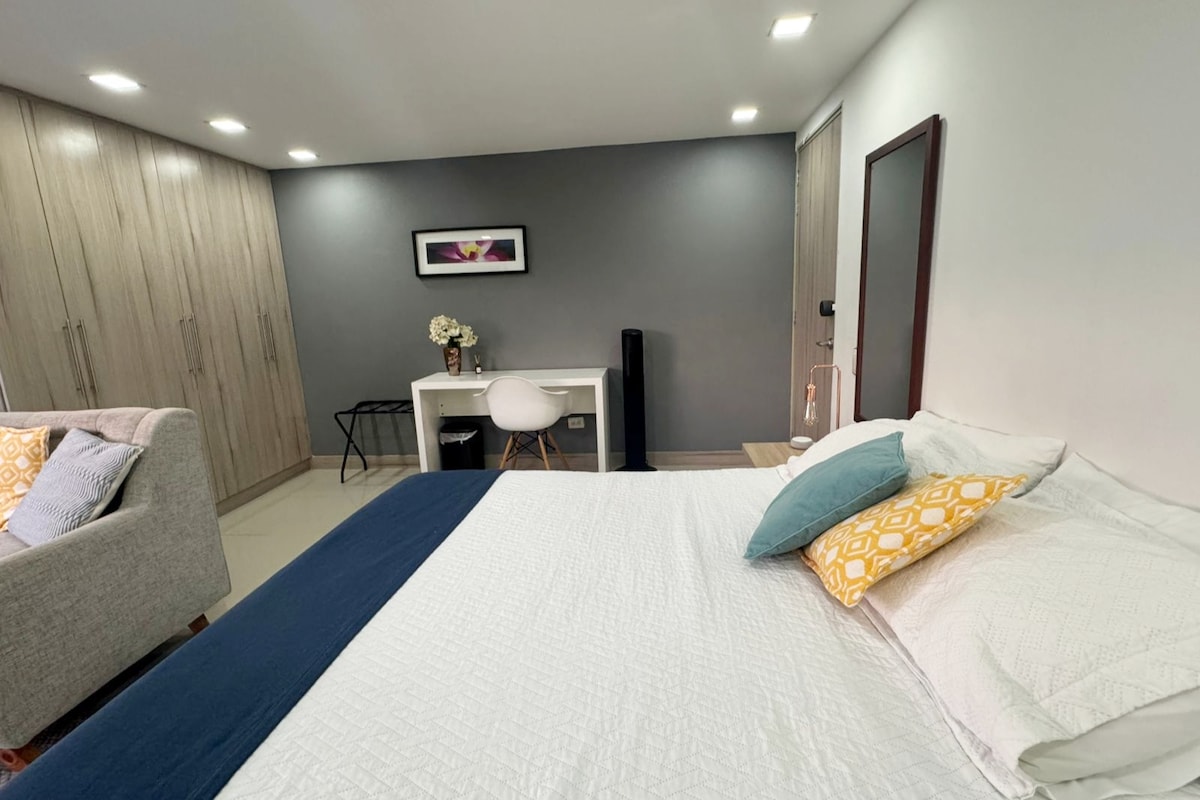 Relax in this elegant, modern apartment in the heart of Manila – El Poblado, just minutes from Provenza, Parque Lleras, and top medical centers such as Clínica Medellín, Clínica Las Vegas, and Clínica El Rosario. ✔Enjoy a king-size bed with premium linens, ✔Stylish bathroom with walk-in shower, ✔Smart TV, ✔High-speed fiber Wi-Fi ✔Fully equipped kitchen. ✔Unwind on your private balcony after exploring the city. ✨Perfect for short stays, business trips, or recovery stays.