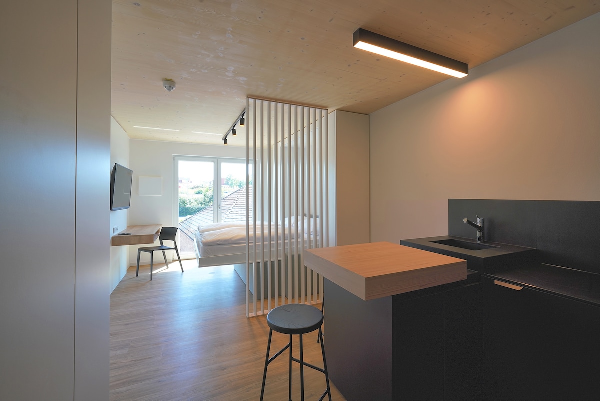 Hotelkamer met eigen badkamer en gemeenschappelijke keuken.